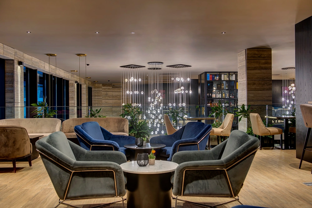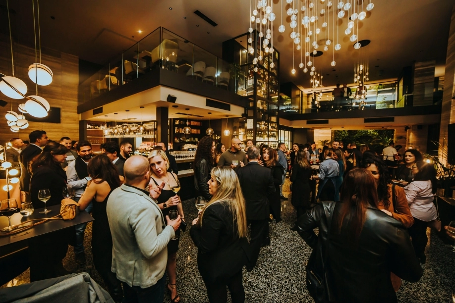 Our first-floor mezzanine offers a more intimate and versatile setting, perfect for private events or relaxed group gatherings. The space is thoughtfully divided into two connected areas — a seated dining section and a cosy sofa lounge — all tied together by a private cocktail bar at the centre.